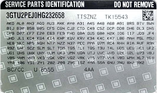 GM Vehicles come with RPO codes, which are 3-character codes that designate various features / options on your vehicle. RPO codes can be found by referencing the Service Parts Identification sticker (typically located in the glove box compartment or near the spare tire), or by scanning a QR code on 2018 and up GM vehicles (located at the bottom of the driver side door pillar).