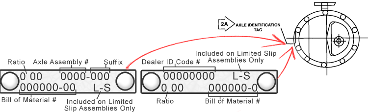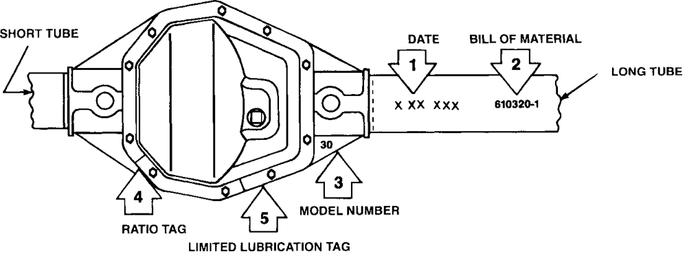 All Spicer Carrier-Type axles are identified with a manufacturing date (1) and Bill of Material (BOM) number (2) stamped on the right or left hand tube on driving axles. The BOM number may also be found on the carrier in some models as shown in illustration (2A). The axle / differential model number will often be cast into one of the webs (3). Each axle contains a gear ratio tag (4), and if the axle is equipped with a limited slip differential, it will have a tag specifying the type of limited slip lubricant to use (5).